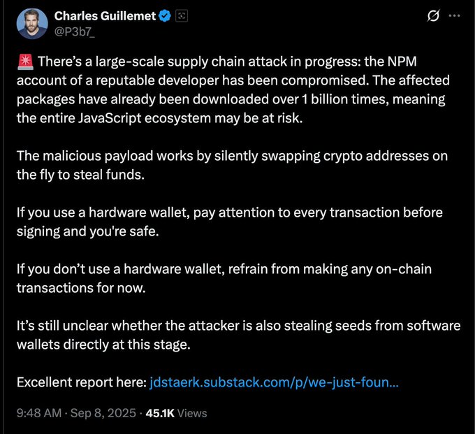 馃毃BREAKING: Ledger CTO Charles Guillemet warns of a supply chain attack in the JavaScript ecosystem after an NPM account compromise. He advises users to carefully verify every transaction if using a hardware wallet, and to avoid on-chain transactions entirely if they don鈥檛.