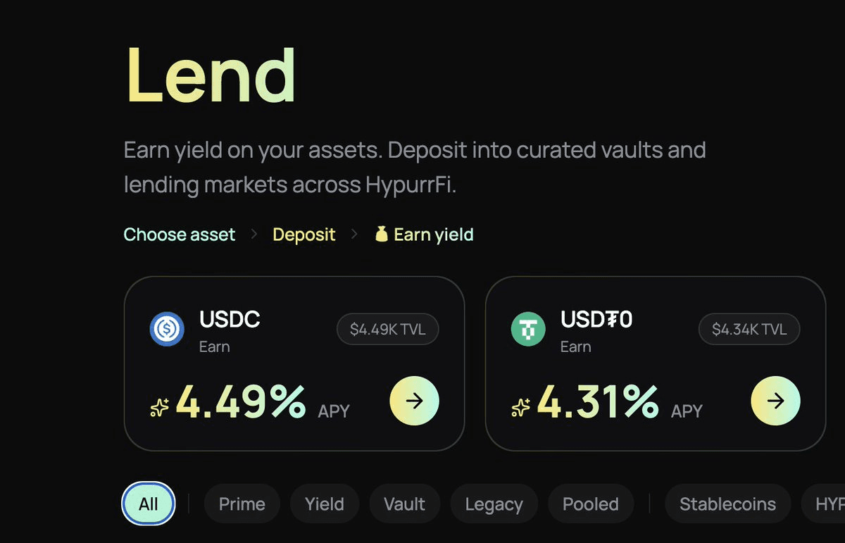 HypurrFi has introduced a structured market system with five distinct options: **Prime** - Lower-risk Euler-style markets with clustered assets and higher inclusion thresholds. Expected to offer lower yields as it matures. **Yield** - Higher-risk Euler-style markets featuring assets with longer redemption times and lower liquidity. Targets higher yields for risk-tolerant users. **Vault** - Deposit-only earn vaults curated by ClearstarLabs, with managed lending strategies. Additional vaults for more assets coming soon. **Legacy** - Original isolated markets being deprecated. Users should withdraw assets and repay debt, with replacements expected in Yield. **Pooled** - Aave v3 market with the deepest liquidity on HypurrFi. Allows cross-collateralization within the pool with socialized debt and partial liquidation. **Key limitation**: Assets deposited in one market type cannot be used as collateral in others. New borrow UX updates are in development.