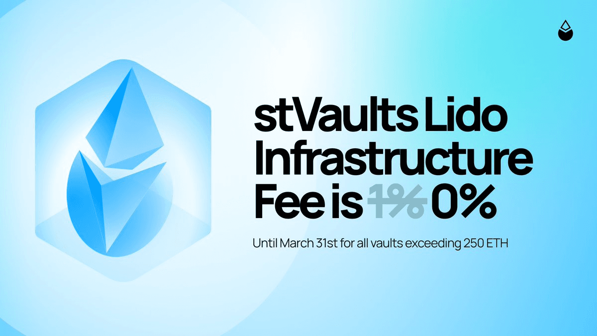 Lido is reminding users that its **stVaults Infrastructure Fee remains at 0%** through March 31st for qualifying participants. **Key Details:** - Fee waiver applies to vaults exceeding **250 ETH** - Standard 1% infrastructure fee temporarily eliminated - Promotion designed as early adopter incentive during Ethereum's extended entry queue period **What are stVaults?** Part of Lido's V3 infrastructure, stVaults enable customized Ethereum staking configurations with features like reserve ratios, risk tiers, and forced rebalancing mechanisms. **How to Participate:** Interested parties can contact the stVaults team through [Lido's application form](https://tally.so/r/mVrkZa) or explore technical details in the [Lido V3 Whitepaper](https://docs.lido.fi/lido-v3-whitepaper). The promotion targets institutional and large-scale stakers looking to optimize their Ethereum staking strategies during the current network conditions. Visit [lido.fi/stvaults](http://lido.fi/stvaults) for more information.