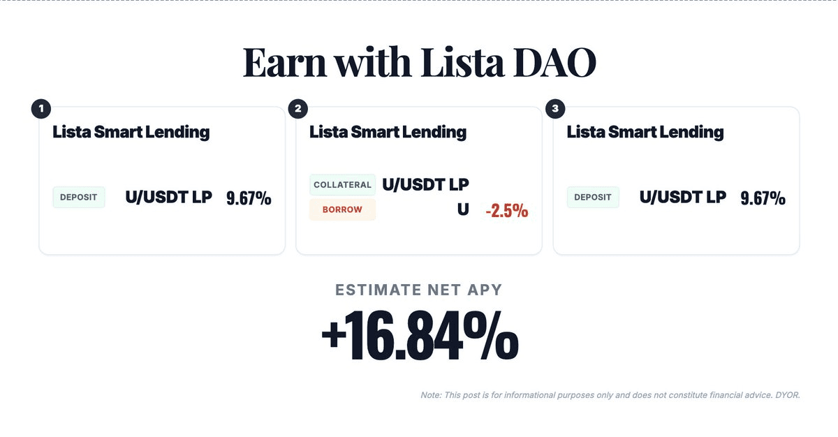 Lista Smart Lending is highlighting a U/USDT strategy with an estimated net APY of approximately **16.8%**, with liquidity expected to arrive soon. **Key Details:** - Strategy focuses on efficient stablecoin deployment - Liquidity provision anticipated in near term - Complements existing Lista lending opportunities **Related Opportunities:** Lista's lending platform currently features: - **Lista USDT Vault**: Borrow USDT at 2.51% on PT-USDe-5FEB2026-(ETH)/USDT market to deploy capital across various strategies - **Lista USD1 Vault**: Borrow USD1 at 2.48% to participate in Re7 USD1 Vault, earning up to ~22% estimated APY These low borrowing rates enable users to unlock liquidity from collateralized assets and enhance capital efficiency across DeFi strategies. [Lista USDT Vault](https://lista.org/lending/market/bsc/0x60415e312f17baaeeb4c00d3fe8bdb24856b18e63fff372a8cc351af00d40082?tab=market) | [Lista USD1 Vault](https://lista.org/lending/market/bsc/0x997cf874bb5fddc1d4fdf29c0a2d4b3d0780cba48fa1d06c559611c064a476b0?tab=market)
