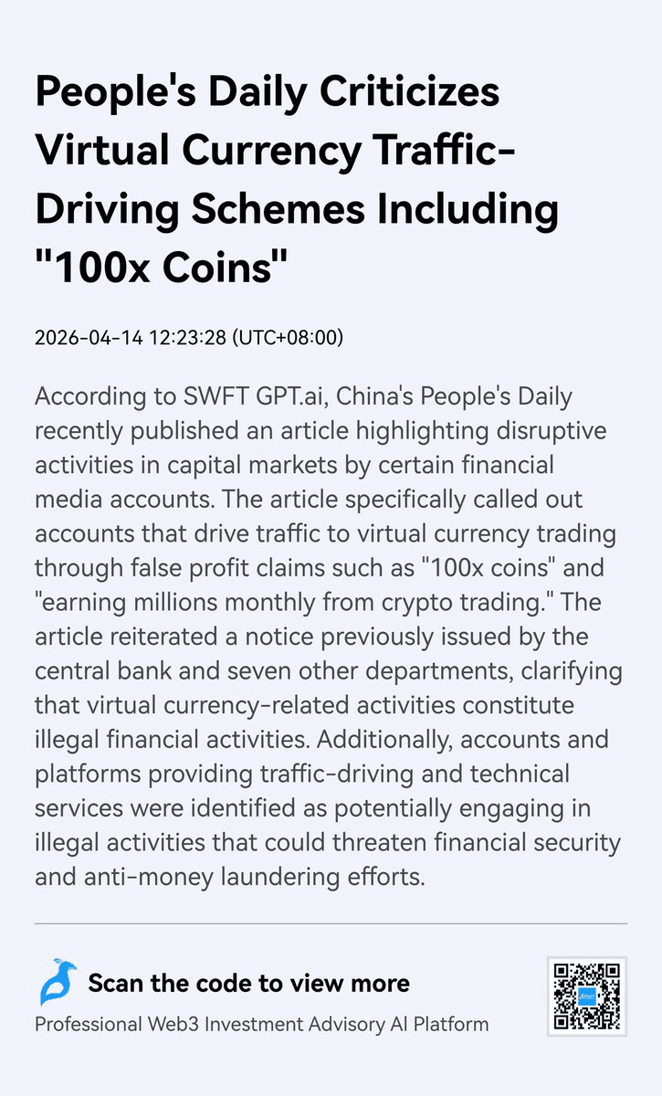 **China's State Media Targets Crypto Marketing** China's People's Daily has launched a crackdown on financial media accounts promoting cryptocurrency investments with exaggerated claims. **Key Points:** - Authorities are scrutinizing accounts that advertise "100x coins" and promises of earning millions monthly - Such promotional activities are being classified as **illegal financial behavior** - This action reinforces China's longstanding position that cryptocurrencies have no legal status in the country **Background Context:** This enforcement action aligns with China's December 2025 statement reiterating that crypto and stablecoins lack legal recognition. The government has ordered stricter enforcement measures to address associated risks. The crackdown specifically targets misleading marketing practices rather than individual crypto holders, focusing on media accounts that promote unrealistic investment returns.