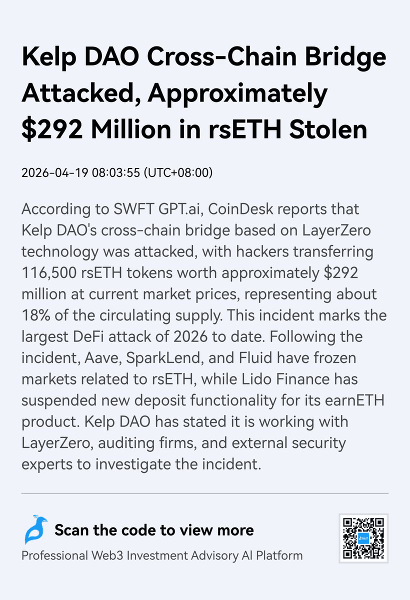 **Kelp DAO's LayerZero bridge suffered a $292 million exploit**, marking the largest DeFi hack of 2026. **How the attack worked:** - Attacker forged a cross-chain message on the bridge - Minted 116,500 rsETH tokens from nothing - Used fake collateral to drain real ETH from lending protocols - Emergency multisig paused operations 46 minutes later **The core vulnerability:** Cross-chain bridges rely on trusting messages between chains. When this trust layer fails, there's no safety net. This incident highlights ongoing security challenges in bridge infrastructure and the risks of wrapped assets versus native cross-chain transfers.