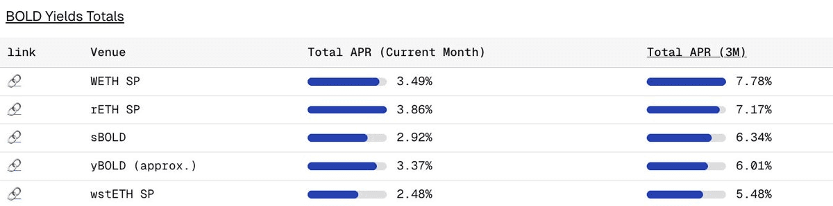 **BOLD Stability Pools** from Liquity V2 are delivering a 7% APR yield with a unique risk profile that sets them apart from traditional DeFi offerings. **Key Features:** - Fully onchain and verifiable yields - No leverage or duration risk - Zero counterparty risk - No TradFi dependencies - No centralized issuer This positions BOLD as a distinct alternative to T-bill wrappers and other DeFi yield products that typically carry additional risk vectors. The Stability Pool mechanism provides transparent, sustainable returns without relying on traditional financial infrastructure or centralized entities. For users seeking stable yields with minimal trust assumptions, BOLD presents a compelling option in the current DeFi landscape.