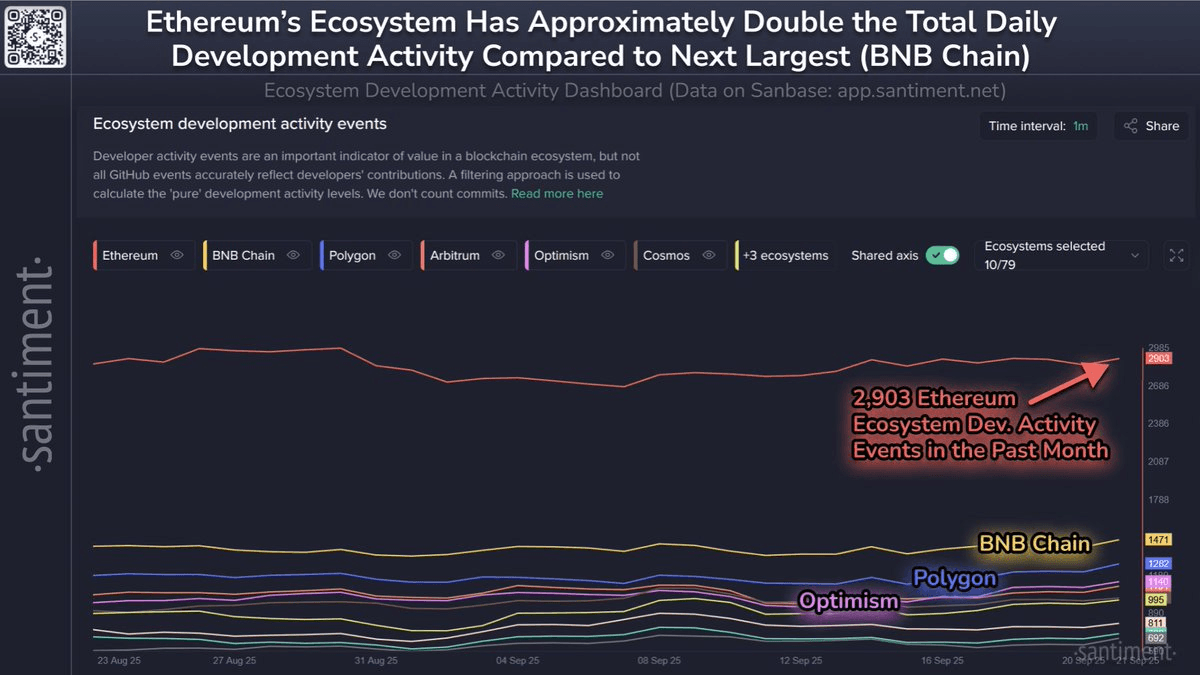 **Ethereum maintains its position** as the top blockchain ecosystem by development activity for the second month running, according to Santiment data. **Current rankings** show: - **Ethereum** takes first place - **BNB Chain** holds second position - **Polygon** secures third place - **Optimism** and **Arbitrum** round out the top five The rankings track total development activity events over a 30-day period, providing insight into which ecosystems are seeing the most active building and coding work. **Previous data** from October 2024 showed all top 10 crypto ecosystems increased their development rates year-over-year, with Optimism leading growth at +45.6%. Developers and investors can monitor ecosystem activity using Santiment's [free development dashboard](https://app.santiment.net/dev-activity?utm_source=twitter&utm_medium=post&utm_campaign=twitter_ecosystem_dev_activity_dashboard_b_092325/&fpr=twitter).