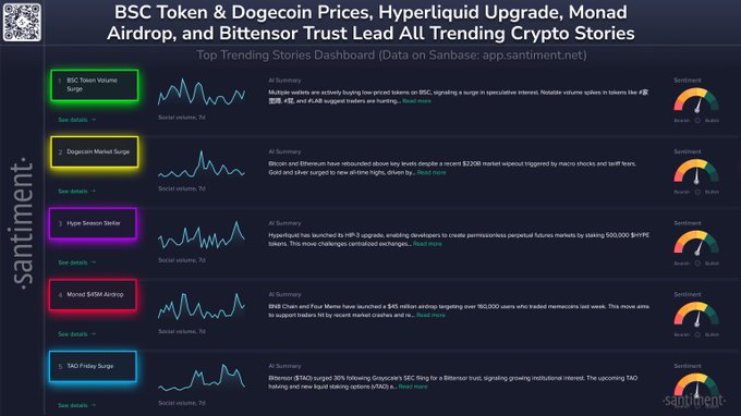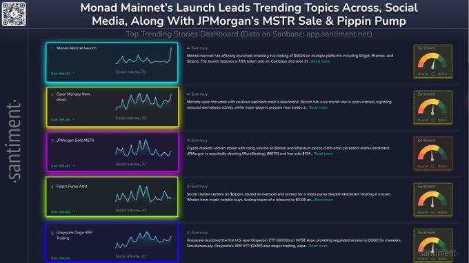 🗣️ According to social media data across X, Reddit, Telegram, 4Chan, BitcoinTalk, & Farcaster, these are the topics driving markets on a bullish Monday: 🥳 Monad Mainnet Launch: Monad mainnet has officially launched, enabling live trading of $MON on multiple platforms including