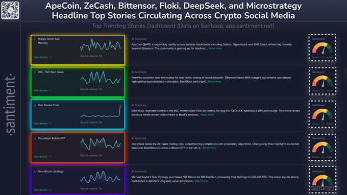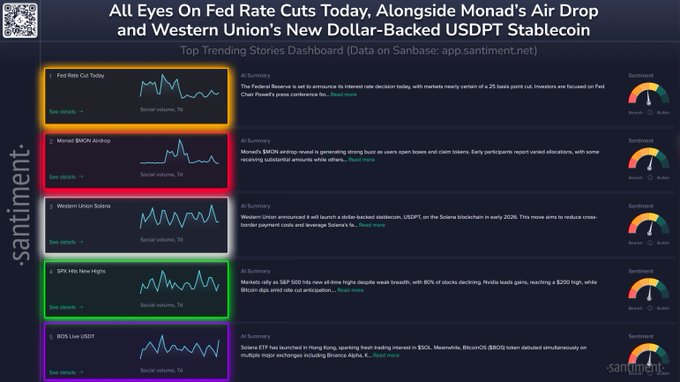 🗣️ Our social data indicates that the rising stories driving crypto markets Wednesday are: 🇺🇸 The Federal Reserve is set to announce its interest rate decision today, with markets nearly certain of a 25 basis point cut. Investors are focused on Fed Chair Powell's press