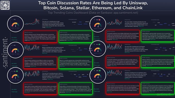 🗣️ The top trending coins in crypto, according to discussion frequency across social media, are: 🪙 Uniswap $UNI: Trending due to major developments around Uniswap (UNI), a leading DeFi protocol. Key proposals include activating protocol fees, burning 100 million UNI tokens,