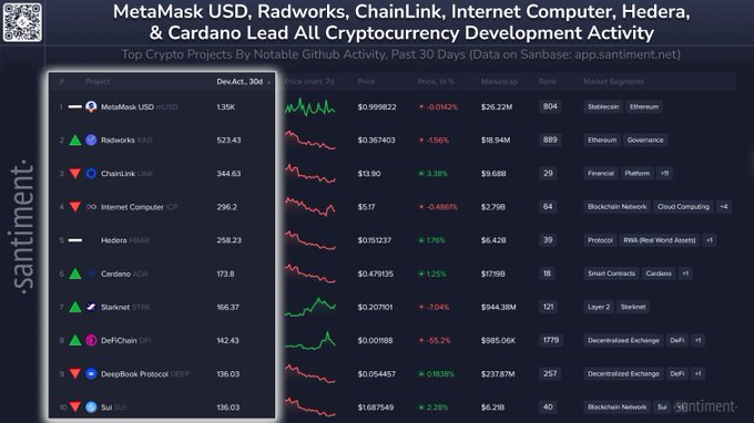 🧑💻 Here are crypto's top overall coins by notable development activity the past 30 days. Directional indicators represent each project's rank rise or fall since last month: ➡️ 1) @metamask $mUSD 🥇 📈 2) @radworks_ $RAD 🥈 📉 3) @chainlink $LINK 🥉 📉 4) @dfinity $ICP ➡️ 5)