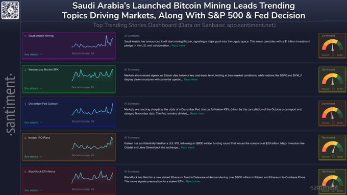 🗣️ The top trending stories driving markets as we drive toward Thanksgiving, are: 🇸🇦 Saudi Arabia Mining: Saudi Arabia has announced it will start mining Bitcoin, signaling a major push into the crypto space. This move coincides with a $1 trillion investment pledge in the U.S.