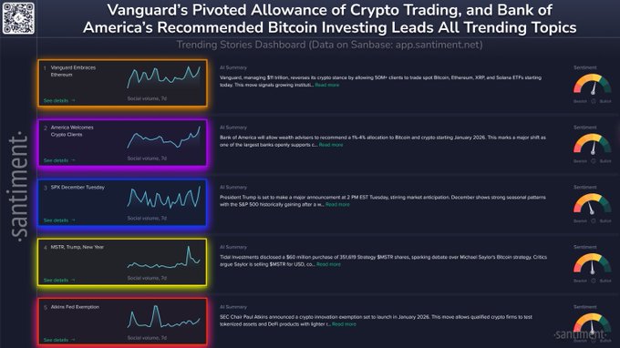 📰 According to rising topics across social media, the top stories in crypto are: 📊 Vanguard Embraces Ethereum: Vanguard, managing $11 trillion, reverses its crypto stance by allowing 50M+ clients to trade spot Bitcoin, Ethereum, XRP, and Solana ETFs starting today. This move