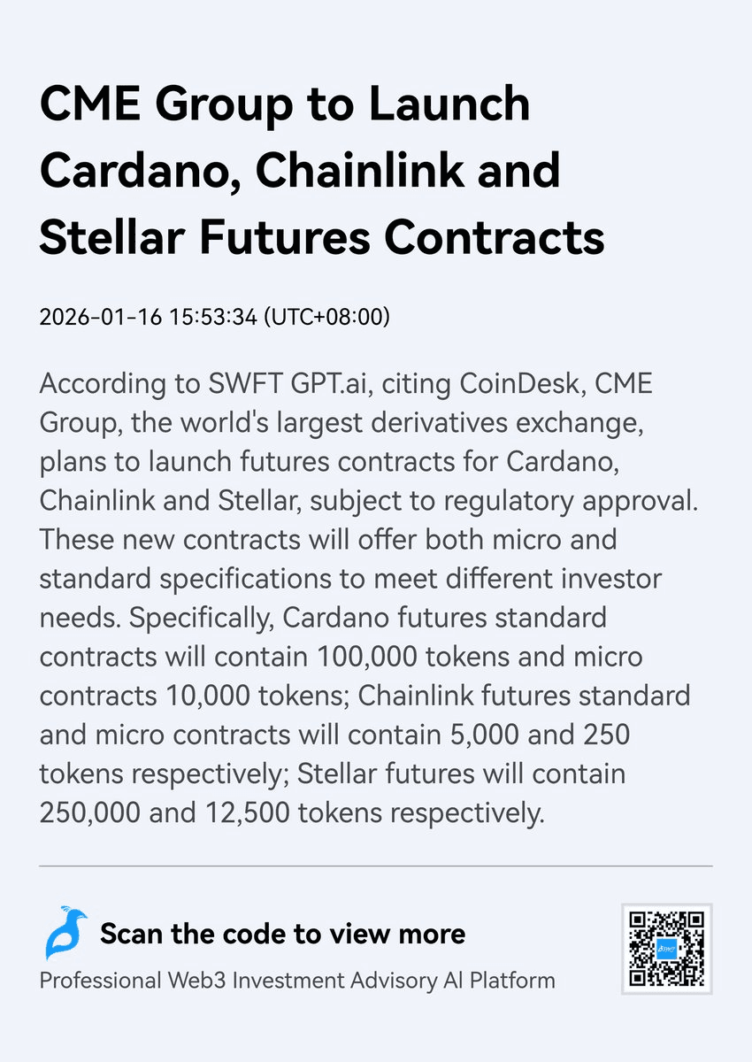 **CME Group**, the world's largest derivatives exchange, is planning to launch futures contracts for three major cryptocurrencies, pending regulatory approval. **Key Details:** - Futures planned for Cardano ($ADA), Chainlink ($LINK), and Stellar ($XLM) - Both micro and standard contract sizes will be offered - Move could unlock significant institutional interest and liquidity This expansion represents a notable step in mainstream adoption of digital assets, as CME's institutional-grade infrastructure provides traditional finance players with regulated access to these cryptocurrencies.