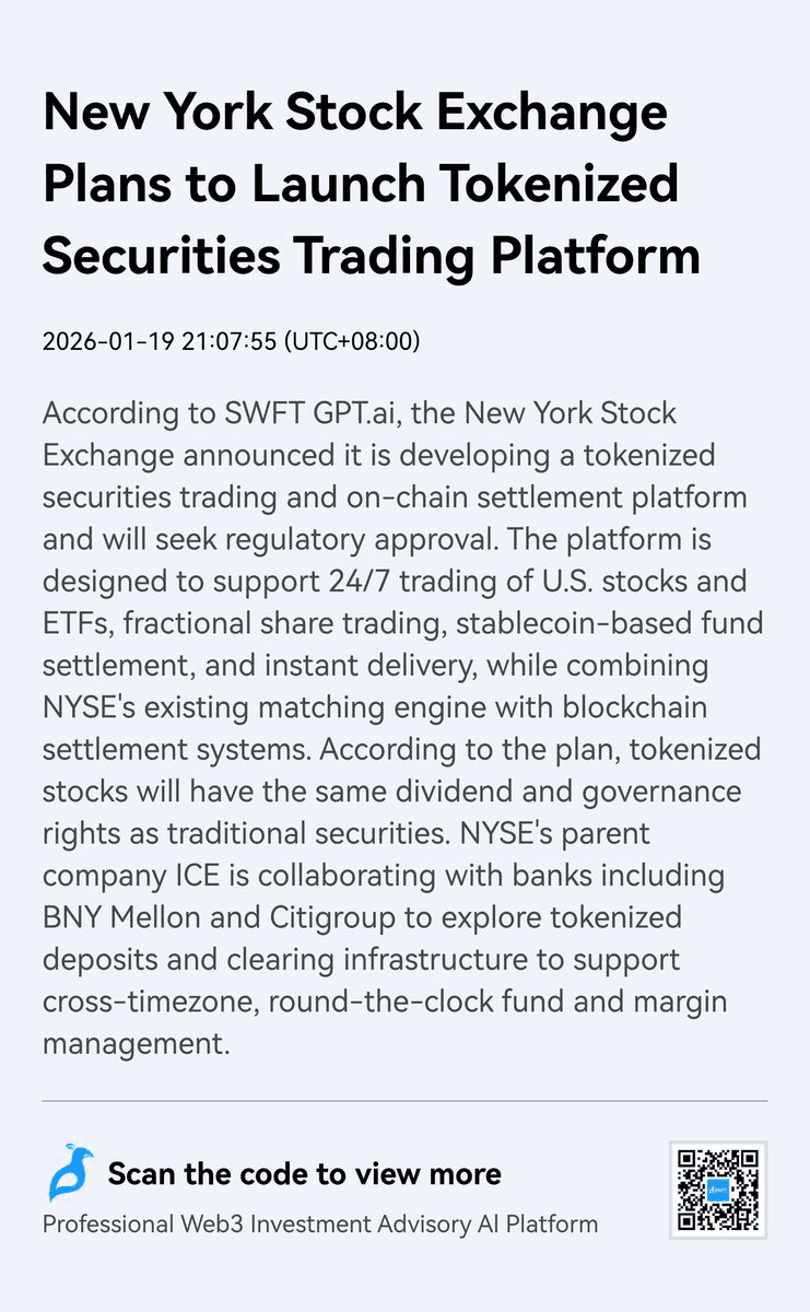 The New York Stock Exchange is building an on-chain platform for tokenized securities that will enable round-the-clock trading of U.S. stocks and ETFs. **Key Features:** - 24/7 market access, eliminating traditional trading hours - Instant settlement using stablecoin-based transactions - Fractional share ownership - Full preservation of dividends and governance rights NYSE President Lynn Martin emphasized that tokenization could bring greater efficiency, transparency and accessibility to capital markets. The move represents a significant shift for traditional finance, as the world's largest stock exchange adopts blockchain infrastructure for securities trading and settlement. This development validates years of work by the tokenization sector and could pave the way for substantial capital flows from traditional markets into blockchain-based systems.