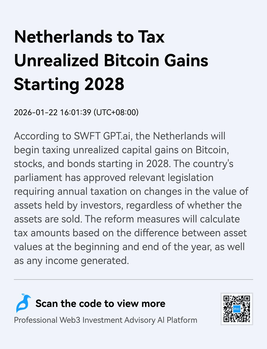 The Netherlands has passed legislation introducing a tax on unrealized capital gains starting in 2028. The new law will apply to assets that have increased in value but haven't been sold yet, including: - Bitcoin and other cryptocurrencies - Stocks - Bonds This marks a significant shift in tax policy, as traditional taxation typically only applies when assets are sold and gains are realized. The 2028 implementation date gives investors roughly two years to prepare for the change. The move could have major implications for long-term holders of appreciating assets, who may face annual tax bills even without selling their holdings.