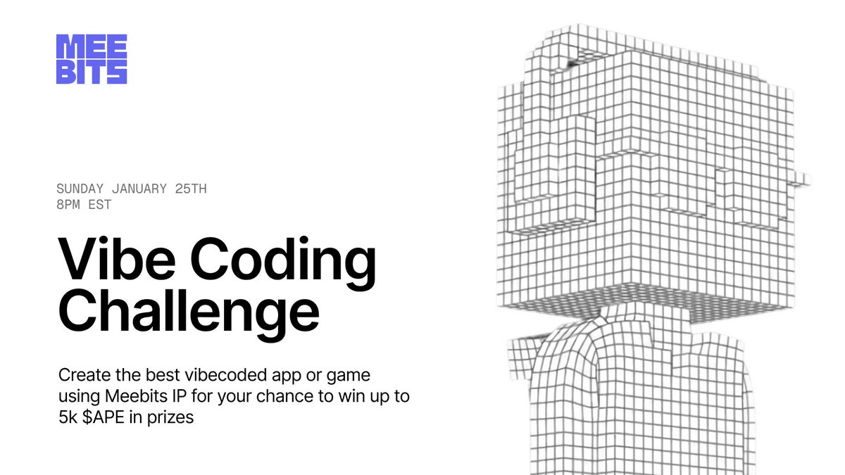Meebits has launched a coding challenge with a 5,000 $APE prize pool. Developers have until January 25th at 8pm EST to submit their entries. **Judging Criteria:** - The "Vibe" & Game/App Feel (35 points) - Meebits Asset Integration (35 points) - Innovation & AI "Magic" (20 points) - UI Presentation & Polish (10 points) **Available Resources:** - Sprite sheets: [https://files.meebits.app/sprites/[id].png](https://files.meebits.app/sprites/[id].png) - GLB files: [https://files.meebits.app/vrm/[id].vrm](https://files.meebits.app/vrm/[id].vrm) Prizes will be awarded to the top three submissions.
