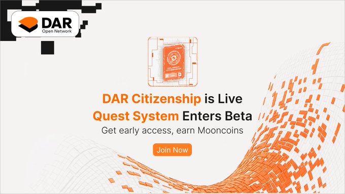 DAR Citizenship is now live! It鈥檚 more than just an ID. Unlock extra perks and smoother gameplay across the ecosystem. The Quest System beta has launched! Complete quests, earn Mooncoins, and help shape the future of DAR gaming. Ready to dive in? Explore here 馃敆