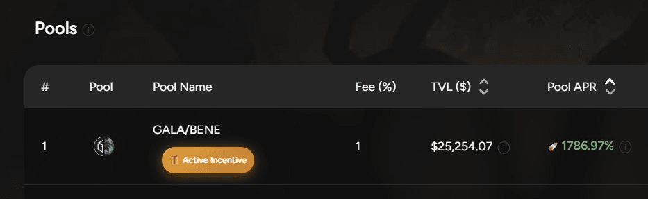 Gala Swap GALA/BENE Pool Shows 1429% APR with $26,755 TVL