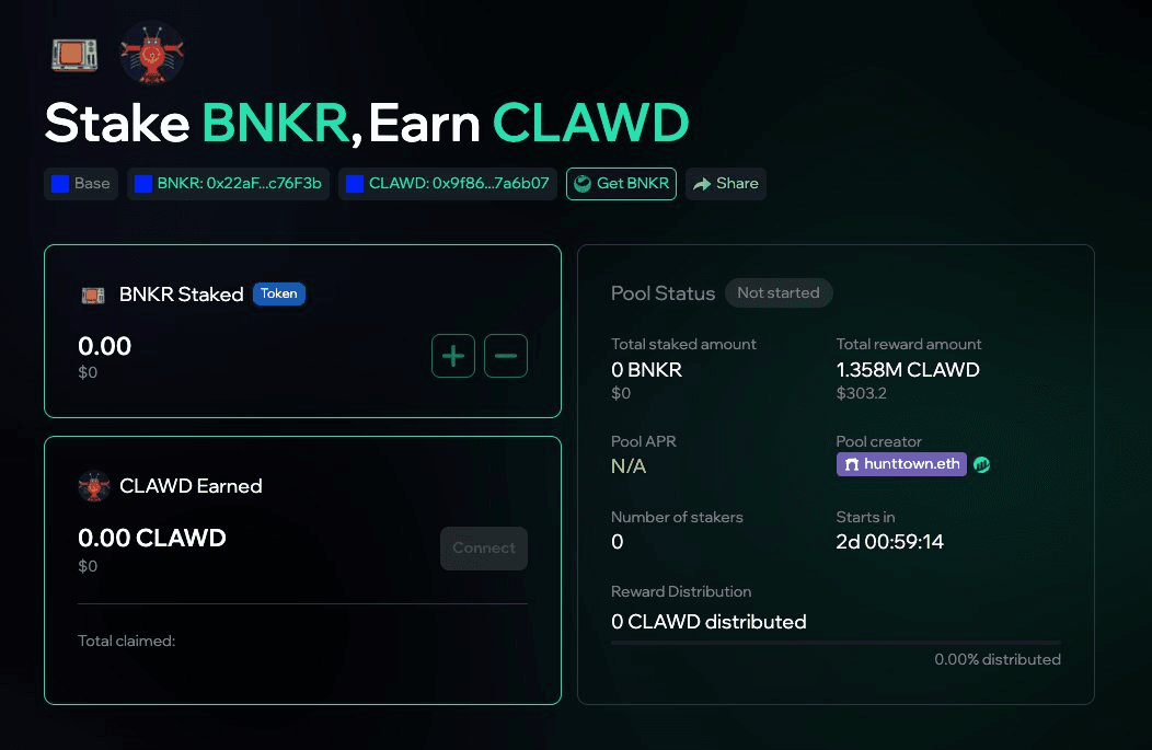 BNKR Staking for CLAWD Rewards Launches on Mint Club