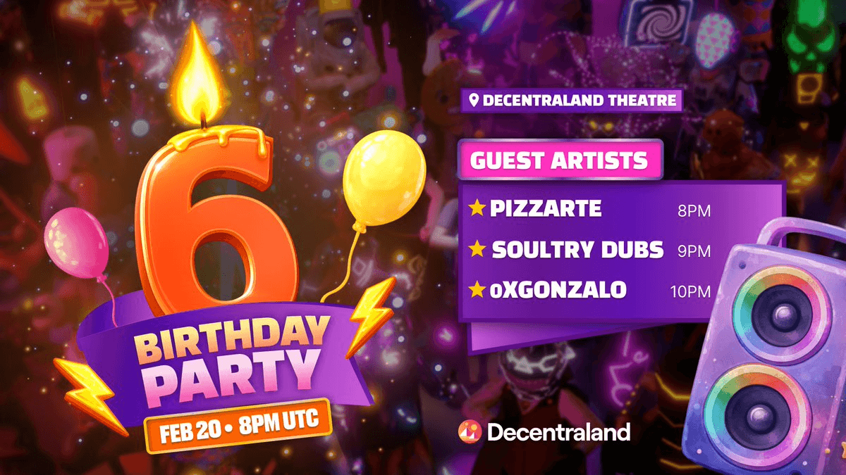 Decentraland marks its sixth year with a community celebration at the Decentraland Theatre on February 20 at 8PM. The event features performances by DJs PiZzArteItaly, SoultryDubs, and 0xgonzalo_. The platform has opened its decks to DJs familiar with the virtual world, inviting them to submit their names to perform at the birthday party. The celebration highlights the community that has supported the platform's growth over the past six years.