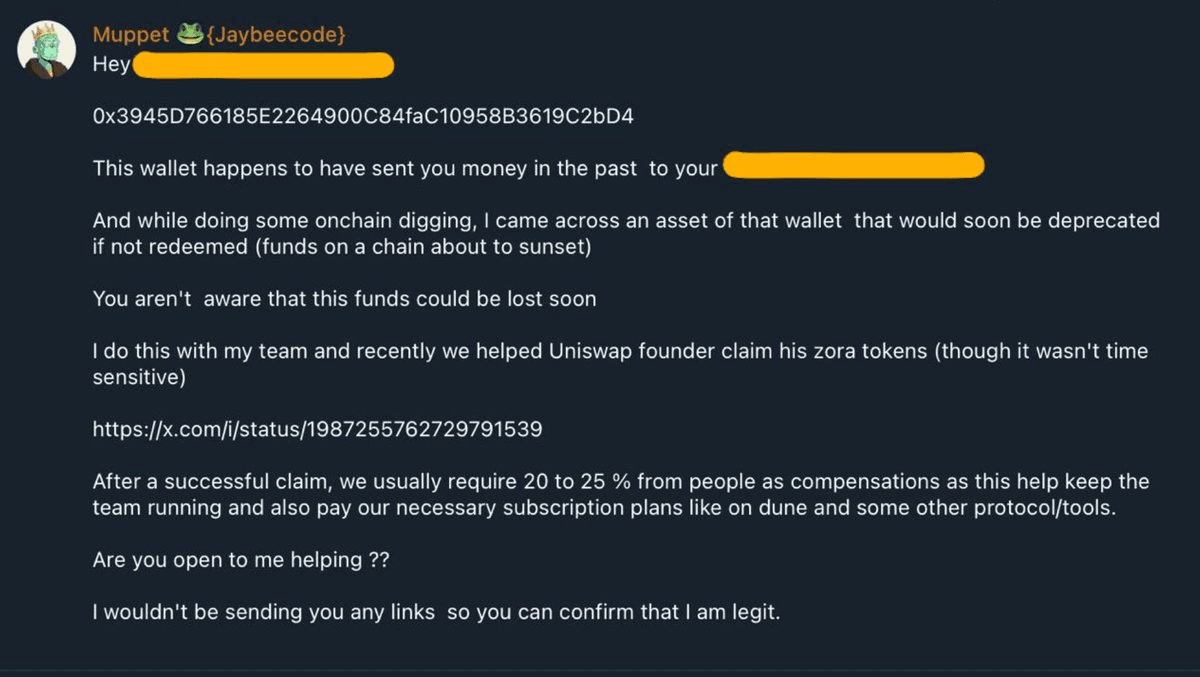 Scammers are actively targeting Gitcoin community members through direct messages on Telegram, LinkedIn, and other platforms with a sophisticated scheme. **The Scam:** - Scammers reference legitimate wallet addresses from previous Gitcoin Grants distributions - They claim users have tokens on a "sunsetting chain" that need recovery - They offer to "help" recover funds for a percentage fee - The campaign appears to exploit the recent zkSync Lite deprecation announcement **What NOT to do:** - Do not respond to these messages - Do not click any links - Do not share seed phrases - Do not connect your wallet - Do not sign transactions **Official channels only:** - X (Twitter) is the primary announcements channel - Telegram updates via official link at [gitcoin.co](https://gitcoin.co) - All legitimate emails come from @gitcoin.co addresses - Verify information through [gitcoin.co](https://gitcoin.co) or contact via 'Partner with Us' link **Remember:** Gitcoin will never DM you offering fund recovery services.