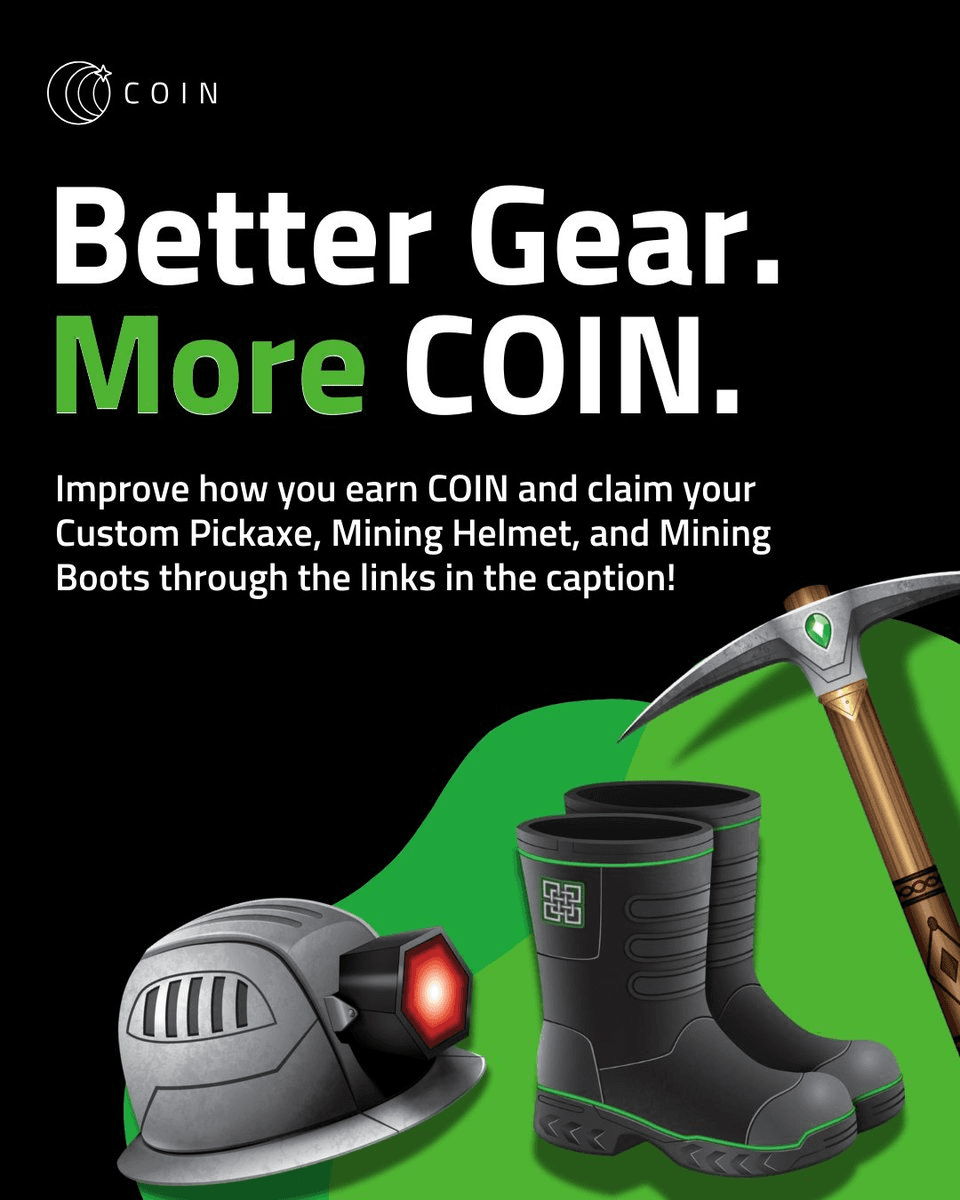 The COIN app has released upgraded mining equipment for users to enhance their earning potential. Three items are now available: - **Mining Boots**: Increases leaderboard rewards, video/audio ad earnings, and checklist bonuses. [Claim Boots](https://my.coinapp.co/applink/claim-boots) - **Mining Helmet**: Boosts rewarded tasks, bonus drops, HODL rewards, and referral rewards. [Claim Helmet](https://my.coinapp.co/applink/claim-helmet) - **Custom Pickaxe**: Enhances team lift bonus, big geomines, tile clearing, and geomining speed. [Claim Pickaxe](https://my.coinapp.co/applink/claim-pickaxe) Users can merge and mint these items into higher-tier gear to further increase their earnings. The gear is available for immediate claiming through the app links provided.