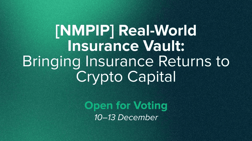 **Nexus Mutual** has opened voting on a new proposal to create a **Real-World Insurance Vault** that would bring traditional insurance returns to crypto capital. **Key Details:** - NMPIP voting is live on Snapshot for the next 3 days - Members can participate in governance decision-making - Proposal aims to bridge traditional insurance with crypto assets **What This Means:** The proposal represents Nexus Mutual's continued expansion beyond pure crypto insurance into traditional financial products. **Next Steps:** Nexus Mutual members should review the full proposal and cast their votes before the deadline. [Vote on Snapshot](https://snapshot.box/#/s:community.nexusmutual.eth/proposal/0x2738d3a859b8fb3bfa61253db6b99dad0093a8ad1dba8380cf2827a0d6d2f171)