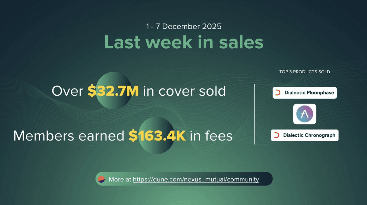 **Nexus Mutual is expanding its crypto coverage offerings this December**, with additional products in development. The decentralized insurance platform continues building on strong momentum from earlier this year when it surpassed **$100 million in active cover** - representing a 3x increase since January. - Platform targeting 10x growth in cover sales by end of 2024 - Focus on providing insurance alternatives for crypto assets - Community dashboard available for tracking coverage metrics The expansion signals growing demand for decentralized insurance solutions in the crypto space as users seek protection for their digital assets. [View coverage dashboard](https://dune.com/nexus_mutual/community)