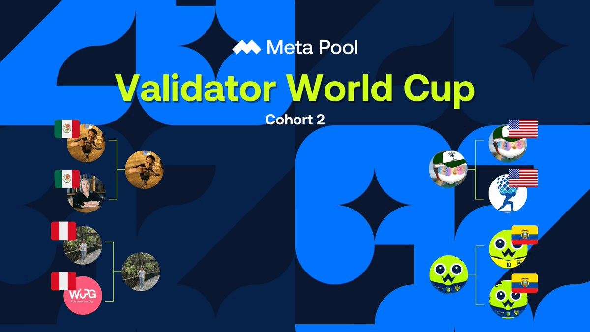 **Meta Pool Validator World Cup Results** The Ecuador matchup in Cohort 2 concluded with **latam-pool.pool.near** securing victory over zklatitudzero.pool.near through community voting. **Key Details:** - Community engagement determined the winner through social media interactions - Both validators competed in a decentralized, public voting format - No traditional judging system - purely community-driven decision - Next round approaching The competition format allowed supporters to vote via likes and retweets, demonstrating grassroots participation in validator selection. Both teams received recognition for their participation in the tournament structure.