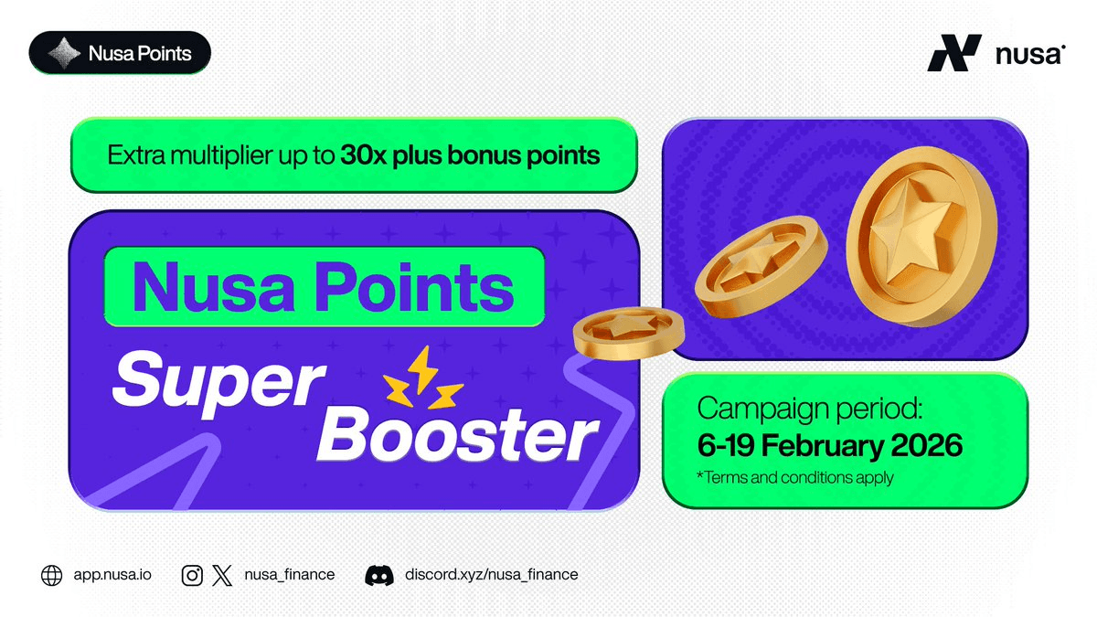 **NUSA Finance launches final rewards campaign** Nusa Finance has activated its Points Super Booster campaign, running February 6-19, 2026. The program offers multipliers up to 30x for on-chain participation. **Four reward mechanisms:** - **No referral required**: All users can now participate without referral codes - **Holding-based booster**: 0.1x multiplier per $NUSA held (max 10x for 100+ tokens) - **Governance booster**: 1x multiplier per locked $NUSA (max 30x) - **Bonus points**: 10 billion NUSA Points distributed to eligible wallets The campaign concludes the year-long NUSA Points program with a 4,000 $NUSA prize pool. Multipliers are calculated from a snapshot taken at campaign start and remain locked throughout. [Read full details](https://medium.com/nusa-finance/nusa-points-super-booster-closing-campaign-for-the-final-phase-9376349b92cf)