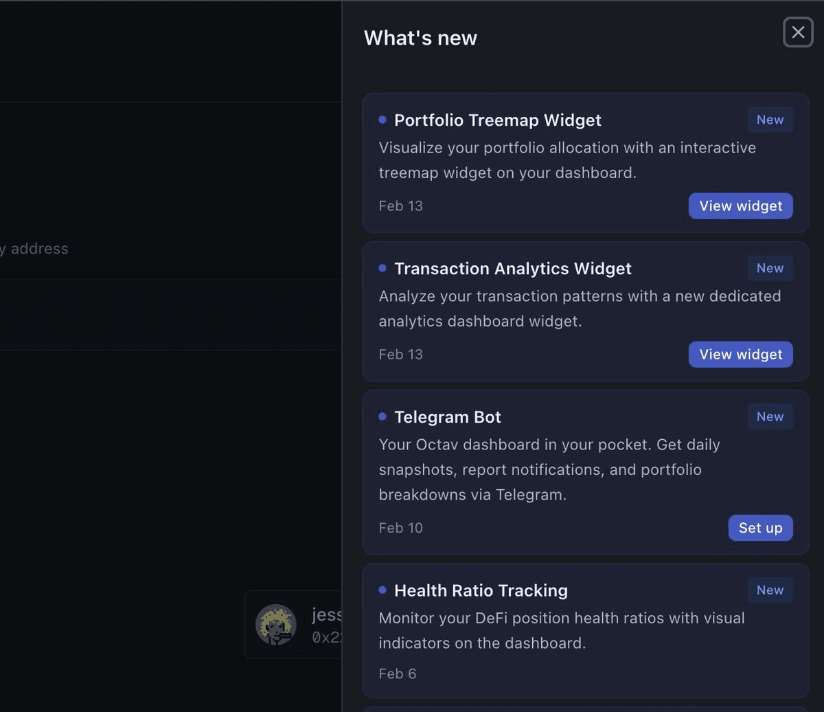 Octav has introduced a **"What's New" feed** directly within their application to address a communication gap with users. **The Problem:** - The team shipped over 20 features in just 2 months - Most users were unaware of these updates - The company acknowledged this as a communication failure **The Solution:** A centralized in-app feed now consolidates all product updates in one accessible location at [pro.octav.fi](http://pro.octav.fi). This move reflects Octav's ongoing commitment to continuous improvement across products, features, performance, and UI/UX.