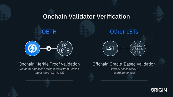 Most LSTs depend on third party oracles to report validator balances. OETH now verifies validator data directly onchain using merkle proofs. Balances are now proven cryptographically onchain, removing 3rd party dependencies.