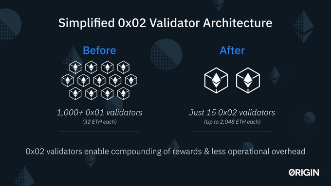 Validator management was redesigned from the ground up. ♻️ $OETH is migrating to 0x02 validators, allowing deposits up to 2,048 ETH. This structure reduces gas costs, lowers deposit minimum to 1 ETH, and automatically reinvests rewards to improve capital efficiency.