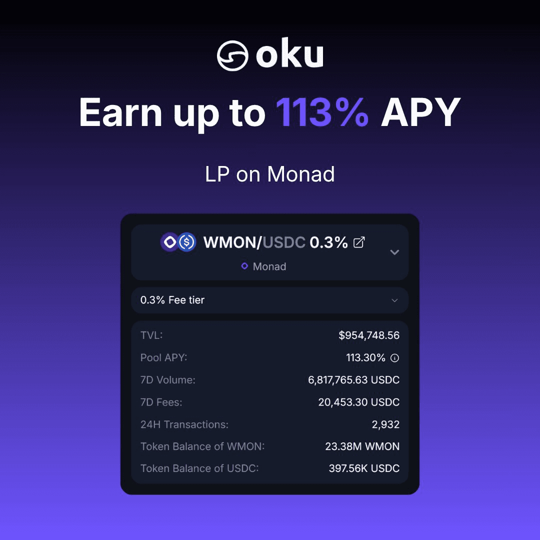 Liquidity providers on Oku's Monad integration have collectively earned more than $20,000 in fees over the past seven days. **Key Points:** - LPs are generating significant yield through Oku's platform on Monad - Weekly fee earnings exceed $20K for participating liquidity providers - Demonstrates active trading volume and fee generation on the platform This milestone highlights growing activity on Oku's DeFi trading platform as users seek yield opportunities across EVM chains.