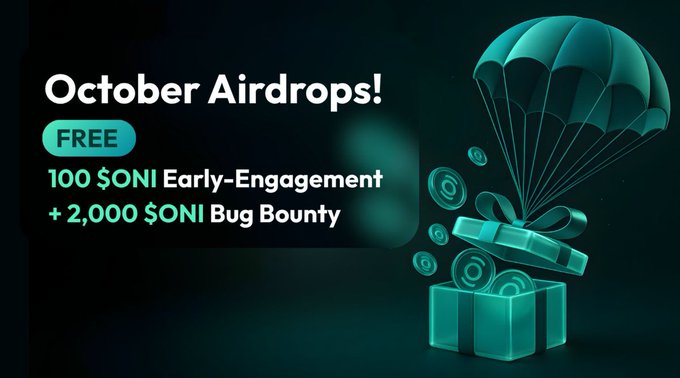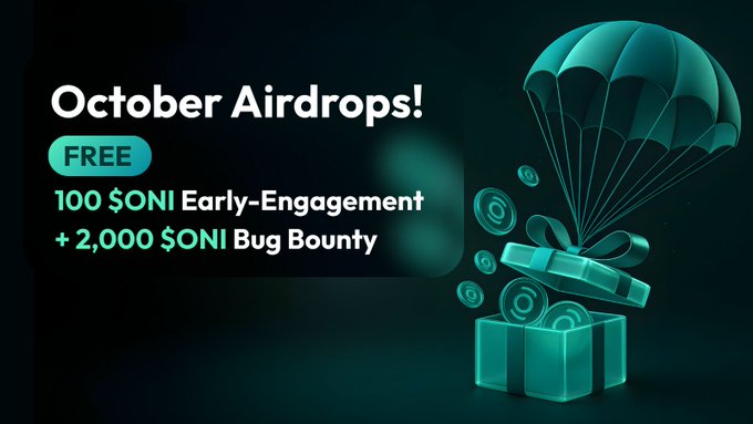 🚀 FINAL CALL for the October Airdrops! We’re celebrating launch month with two community rewards: 1) Early Engagement - 100 ONI Help us kickstart the platform. Create your account, explore the dashboard, and register interest in upcoming assets to qualify. 2) Bug Bounty - up