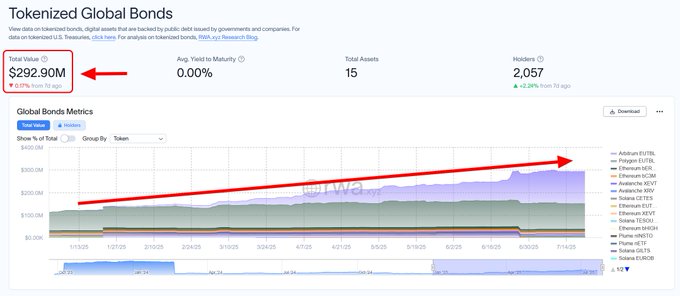 THIS IS INSANE: Tokenized bonds just hit $292M — a new all-time high That’s a 163% surge since the start of the year. Ignore RWA at your own risk. ⚠️