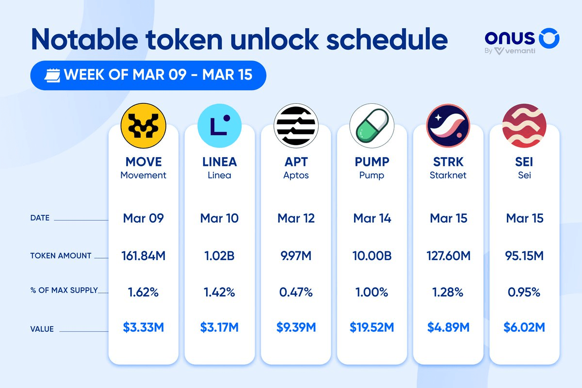 **Major token unlocks scheduled for March 16-22** Over $220 million worth of tokens from projects including CRO, ASTER, and ZRO will be unlocked this week. **Key points:** - New supply entering circulation may trigger market volatility - Previous week saw Movement, Aptos, and Pump unlocks, with PUMP alone releasing nearly $20M - Token unlocks typically create short-term price fluctuations as supply increases Traders should monitor these unlock events as they often present both opportunities and risks in the market.