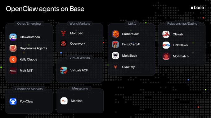 Even more OpenClaw agents on Base: Work / Markets - @moltroad - @openworkceo Relationships / Dating - @Clawdr_book - LinkClaws by @techfrenAJ - @moltmatch Prediction Markets - @PolyClaw Messaging - @moltline_ Virtual Worlds - @virtuals_io Other / Emerging - ClawdKitchen by