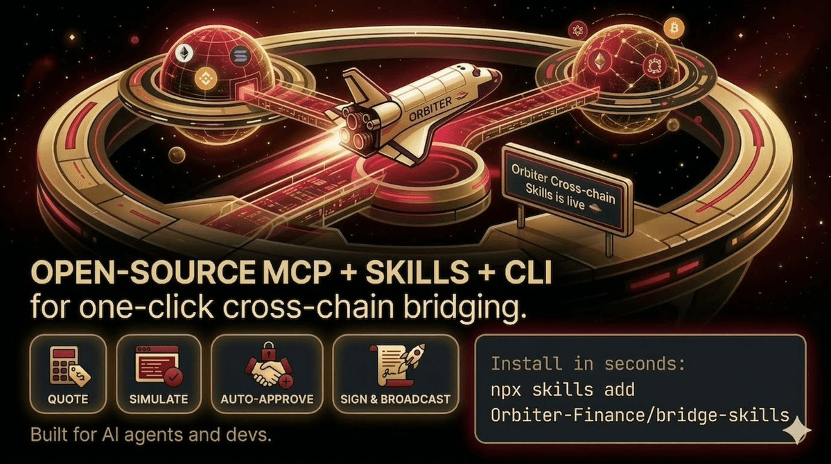 Orbiter Finance has released **Orbiter Cross-chain Skills**, an open-source toolkit combining MCP (Model Context Protocol), Skills, and CLI for streamlined cross-chain bridging. **Key features:** - One-click bridging with quote, simulate, auto-approve, sign, and broadcast functions - Built specifically for AI agents and developers - Quick installation in seconds This launch builds on Orbiter's infrastructure supporting 40+ networks with reduced fees and improved liquidity management. The integration of MCP technology positions the platform at the intersection of Web3 and AI automation. [Installation guide](https://docs.orbiter.finance/developer/orbiter-skills-usage-guide)