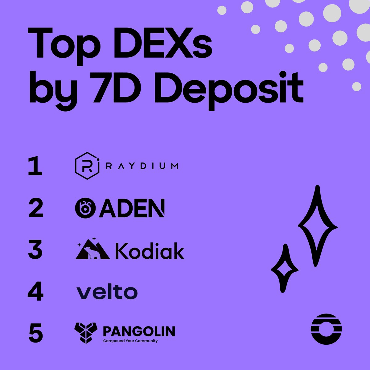 **Top DEXs by User Deposits (Past 7 Days)** - **Raydium** maintains the #1 position for user deposits - **Aden** holds second place - **KodiakFi** ranks third - **VeltoApp** takes fourth - **Pangolin** rounds out the top five Several new decentralized exchanges have entered the rankings, indicating shifting user preferences in the DEX landscape. This follows last week's revenue data showing which platforms generated the most fees from trading activity.