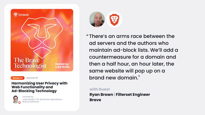 Learn about the arms race between Big Tech and ad blockers in the newest #TheBraveTechnologist episode. Listen to @LukeMulks' full chat with Ryan Brown (@fanboynz, Filterset Engineer at Brave) and Pete Snyder (Senior Privacy Researcher at Brave) here: kite.link/S8E18