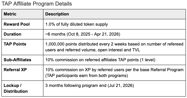 **Paradex's Token-Aligned Program (TAP) receives strong initial response** The crypto derivatives exchange received over 100 affiliate applications in the first week of its TAP program launch. The company has begun detailed reviews of submissions and will continue accepting applications for a limited time. **Two-tier rewards structure now live:** - **Standard Referral Program**: 10% commission on referred users' XP (minimum $10k volume requirement) - **TAP Affiliate Program**: Dedicated 1% token allocation for qualified affiliates with large followings or trading groups **TAP eligibility criteria:** - 5,000+ social media followers/subscribers - Trading or alpha group affiliations - Demonstrated ability to drive platform growth TAP affiliates earn from both programs simultaneously, with first points distribution scheduled for October 22, 2025. Affiliates can set referee reward rates between 10-100% through the upcoming dashboard. [Apply here](https://forms.gle/A6raA1inXn7GkqFh7) if you meet the criteria and can demonstrate your potential impact on Paradex growth.