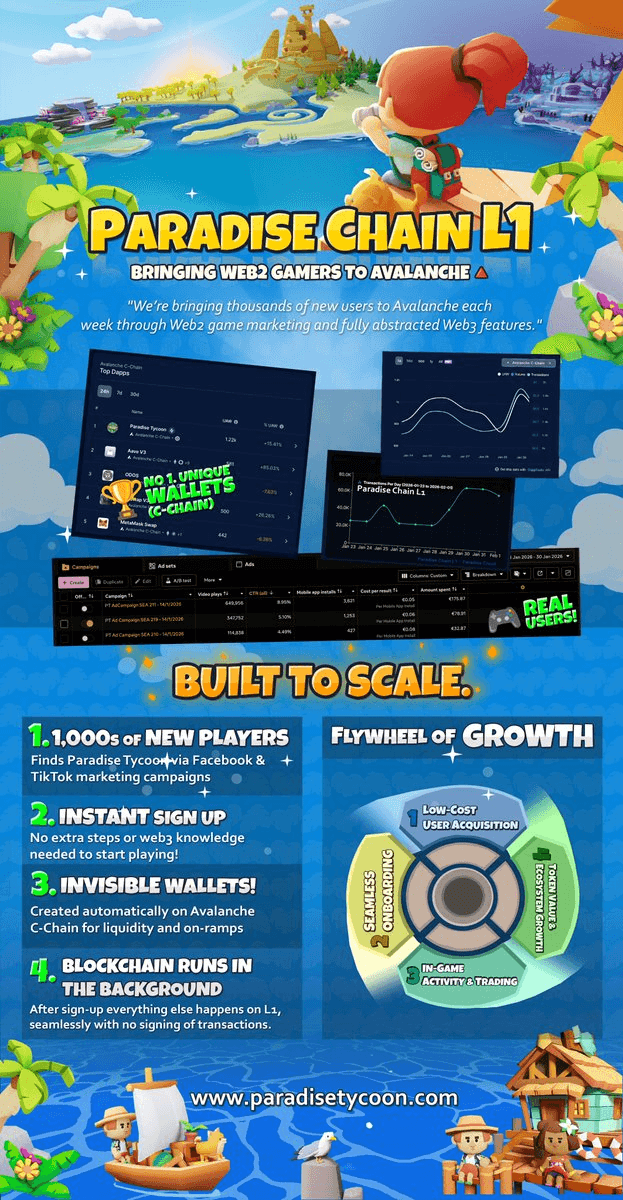 Paradise Tycoon has launched Paradise Chain L1 on Avalanche, using a hybrid model to onboard thousands of players weekly through traditional Web2 channels. **How it works:** - Players discover the game via Facebook and TikTok ads - Sign up takes seconds with no wallets or seed phrases required - Avalanche C-Chain handles onboarding and wallet creation - Paradise Chain L1 processes gameplay actions like trading and crafting - Blockchain remains invisible to players The approach is showing results. Paradise Tycoon ranks as a top C-Chain dApp by active wallets according to DappRadar. The chain was built using years of live game data and real player behavior. It's designed to support multiple games, with Paradise Legends planned as a future title. [Read more details](https://paradisetycoon.medium.com/paradise-chain-l1-is-live-0cd0e99986e1)