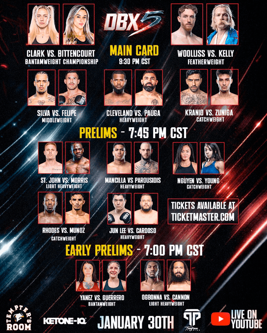 DBX is BACK! Tomorrow, @DirtyBoxing_ takes over Houston with a stacked card! The main event will crown the first-ever Women鈥檚 Bantamweight Champion as Clark faces Bittencourt for the title. The co-main is going to be an absolute war, with Wooluss squaring off against Kelly.