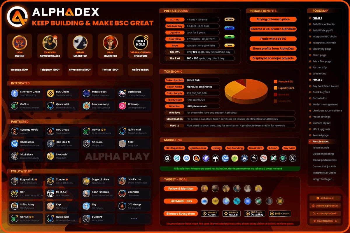 AlphaDex AI has released its V2 beta decentralized application on the Binance Smart Chain through PinkSale's launchpad platform. **Key Details:** - The project is conducting a fair launch on PinkSale - V2 beta DApp is now live on BSC - The development team bought back all private sale tokens to maintain price stability at launch - The team includes experienced developers and tier-1 key opinion leaders The fair launch is accessible through [PinkSale's platform](https://www.pinksale.finance/launchpad/bsc/0xfaD65FEf65cB344695d8390203EAb790900E6eC1).