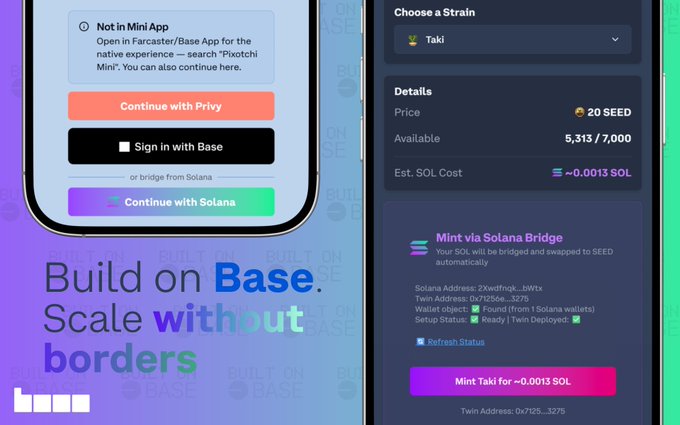 Pixotchi has developed a custom integration with the new Base ↔ Solana bridge, allowing players to interact with their Base app directly through native Solana wallets.