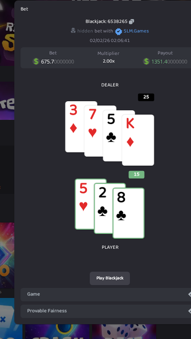 Dealer busted at 25. Player walked away with $1,351. $675 bet. 2x payout. Provably fair Blackjack. Every hand verifiable on-chain. slm.games