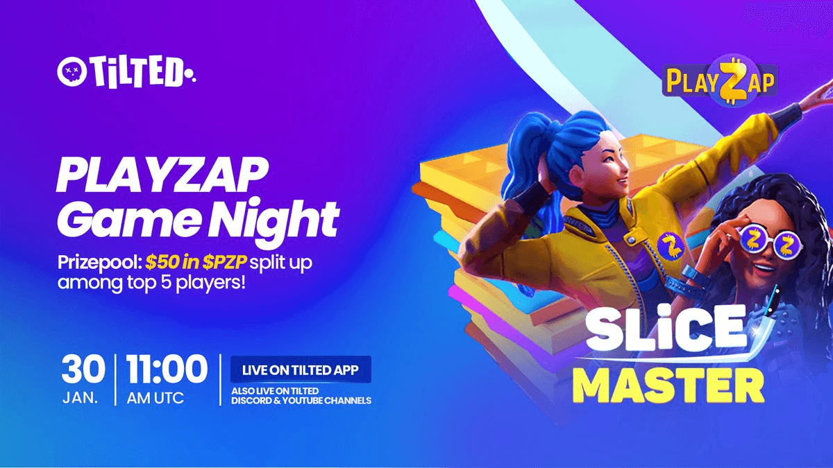 PlayZap is hosting a game night tournament in partnership with Tilted, a platform for tokenizable game assets. **Event Details:** - **Date:** Friday, January 30, 2026 - **Time:** 11 AM UTC - **Game:** Slice Master - **Prize Pool:** $50 in $PZP tokens for top 5 players **How to Participate:** 1. Search @PlayZap_Bot on Telegram 2. Type /start 3. Launch the app and join the game night The tournament will be livestreamed on Tilted's Discord and website. This collaboration brings together PlayZap's Telegram mini app gaming platform with Tilted's creator economy for game assets.