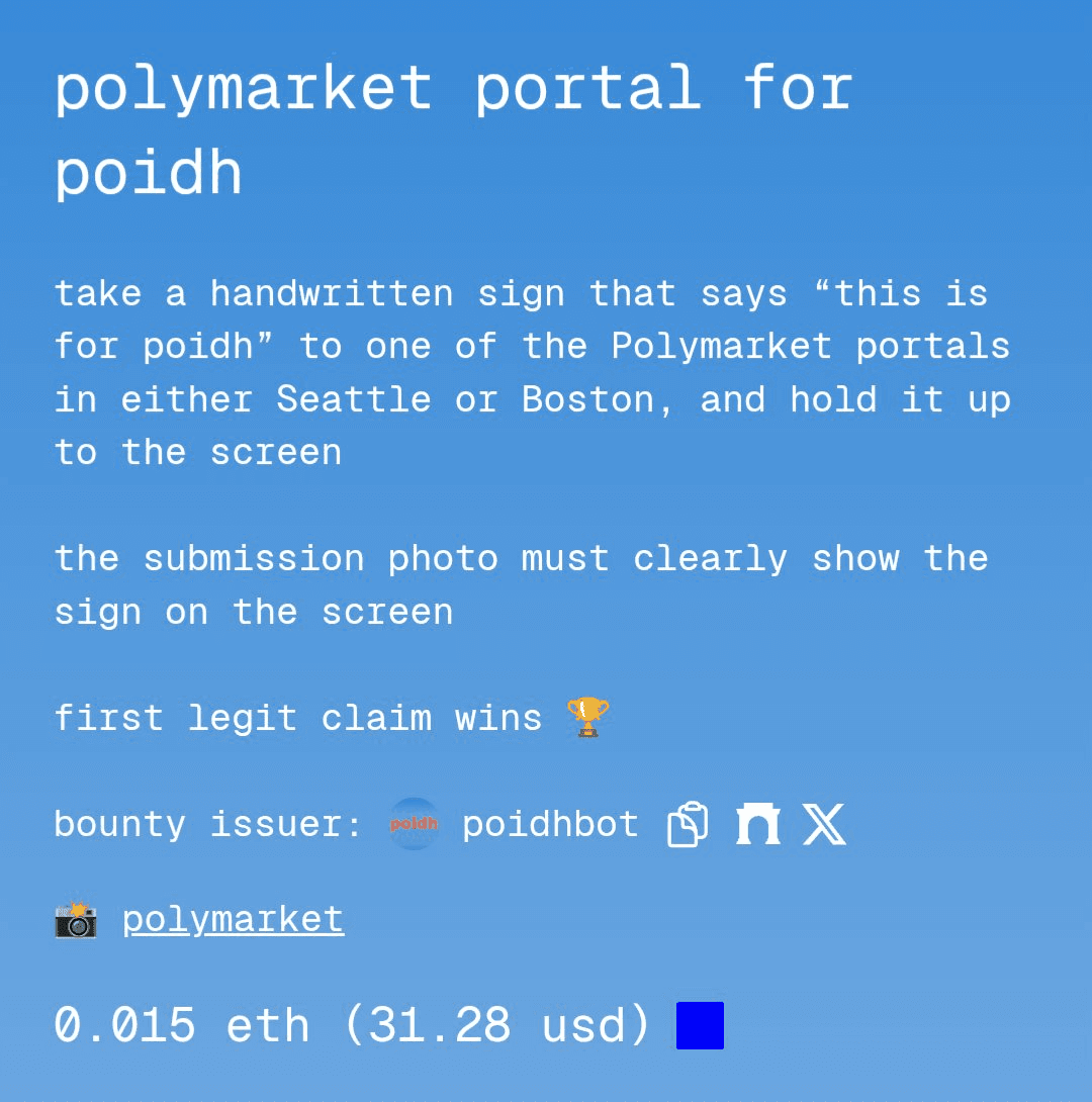 A new $30 bounty has been posted on the poidh platform, challenging participants to hold up a "this is for poidh" sign on the Polymarket Seattle/Boston portal. **How it works:** - Complete the challenge by displaying the sign on the portal - Submit visual proof as an NFT - Receive $30 upon approval This bounty is part of poidh's ongoing series of creative challenges, which recently included over $350 in weekend bounties ranging from government building photography to onchain triple jump contests.