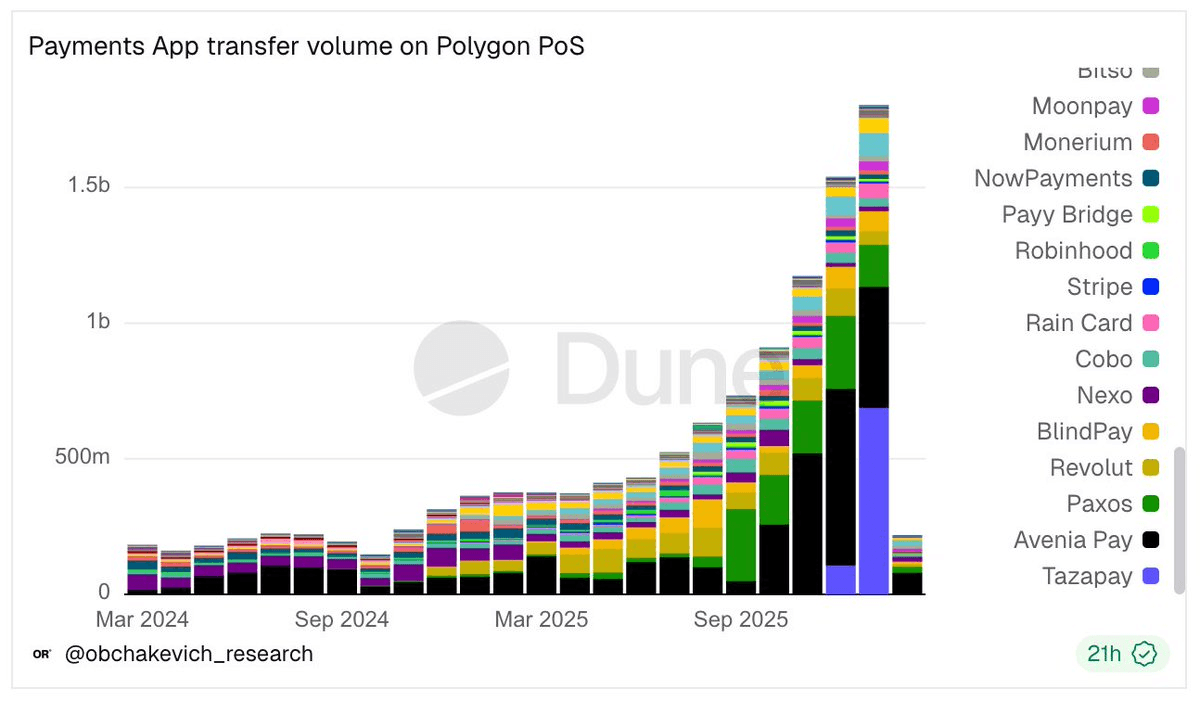 Tazapay has set a new record by processing $687 million in transactions on Polygon in just one month, marking a significant milestone for payment infrastructure on the network. This achievement comes as part of a broader trend of payment adoption on Polygon: - Payment apps moved $1.82B across 50 platforms in Q3 2025, up 49% from Q2 - Stablecoin-linked crypto card volume reached $322M across Visa and Mastercard - Total stablecoin supply on Polygon increased 22% to nearly $3B, driven primarily by USDT growth of 35% to $1.4B **Transaction costs continue to decline:** - Average POL transaction fee: 0.0114 POL (23.6% lower) - Average USD fee: $0.0027 (12.8% lower) The network's focus on payments infrastructure and the Gigagas roadmap appears to be driving adoption, with POL market cap growing 39% to $2.36B in Q3. RWA tokenization also reached $1.14B during the period. Full analysis available in the [Messari Q3 2025 Polygon report](https://messari.io/report/state-of-polygon-q3-2025).