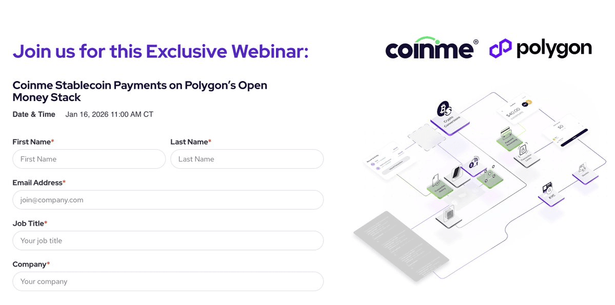Polygon is hosting a **live webinar on January 16 at 11:00 AM CT** featuring Coinme's stablecoin payment solutions within the Polygon Open Money Stack. The session targets developers and businesses working on: - Payment systems - Wallet applications - Financial products This follows Polygon's recent focus on stablecoin infrastructure and cross-border payment solutions, building on their Money Rails initiative that explores how blockchain technology upgrades traditional money systems. Interested participants can register at [Coinme's enterprise webinar page](https://coinme.com/enterprise/webinar).