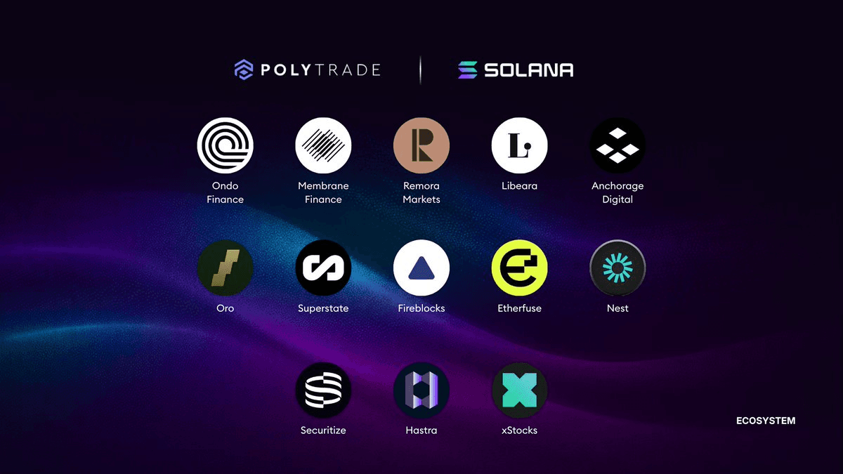 Polytrade has integrated 14 real-world asset (RWA) protocols from the Solana ecosystem into its marketplace. The integration includes established players like Ondo Finance, Securitize, Fireblocks, and Superstate. **Key participants:** - Infrastructure providers: Anchorage, Fireblocks, Etherfuse - RWA protocols: Ondo Finance, Membrane Finance, Remora Markets - Lending platforms: Nest Credit, Hastra Fi - Asset tokenization: Securitize, xStocks Fi, Oro Gold, Libeara This follows Polytrade's earlier March integration of Solana into its multi-chain marketplace, which already supported Ethereum, BNB Chain, Arbitrum, and Polygon. The platform provides small businesses access to capital while offering investors stable yields through tokenized real-world assets. Polytrade's V2 features non-custodial wallets, on-chain KYC through decentralized identity (DID), and endless pools that automatically allocate capital across DeFi protocols for additional yield generation.